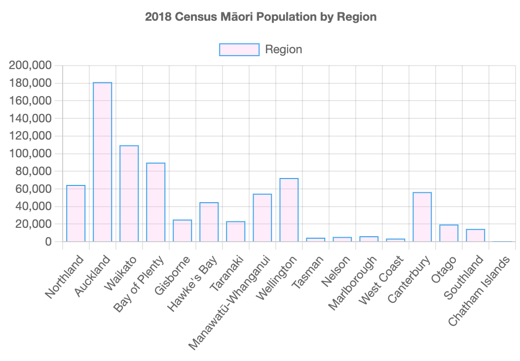 On an internet search for 'Māori population distribution by region', I could not find the data presented in the format that I wanted. So I just went through the Census Data 2018 and quickly put together the interactive charts. Maybe the next step is to model other years census data to see the migration patterns/trends or to do a cohort analysis of population distribution and Iwi wealth distribution (I've put a table at the end of this document)? Anyway, maybe this is useful for you.
